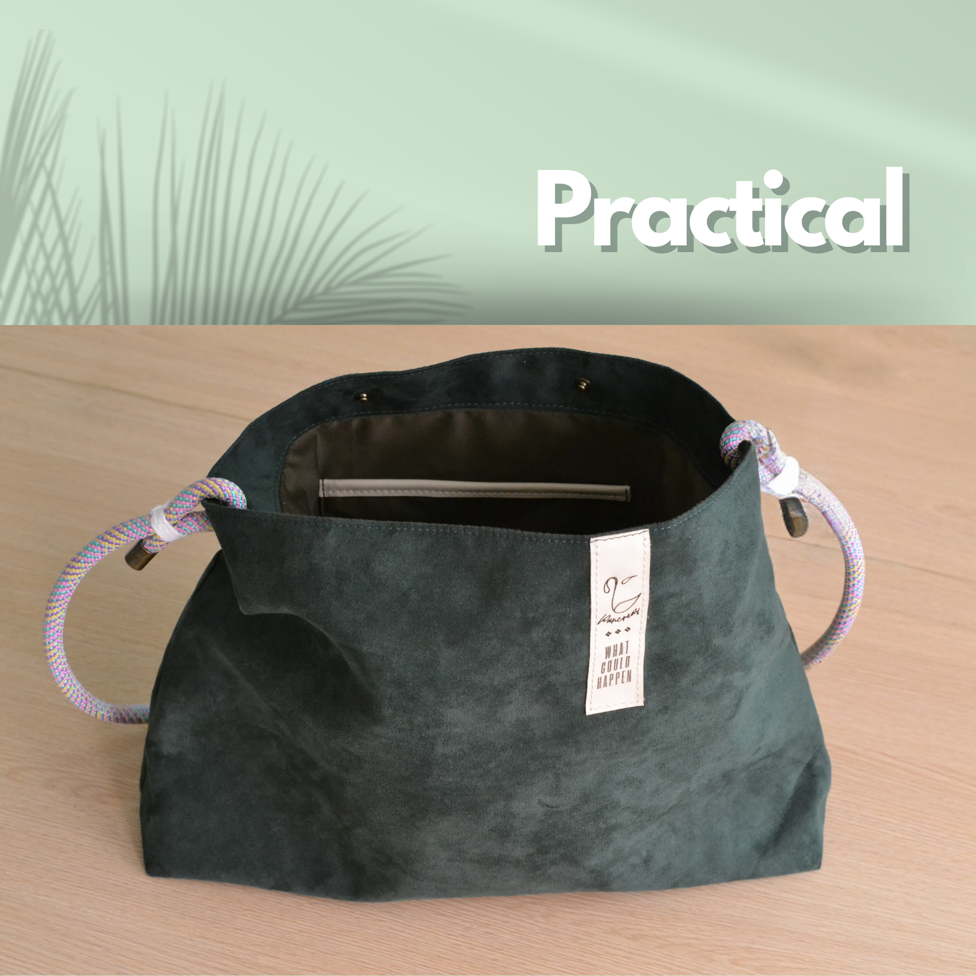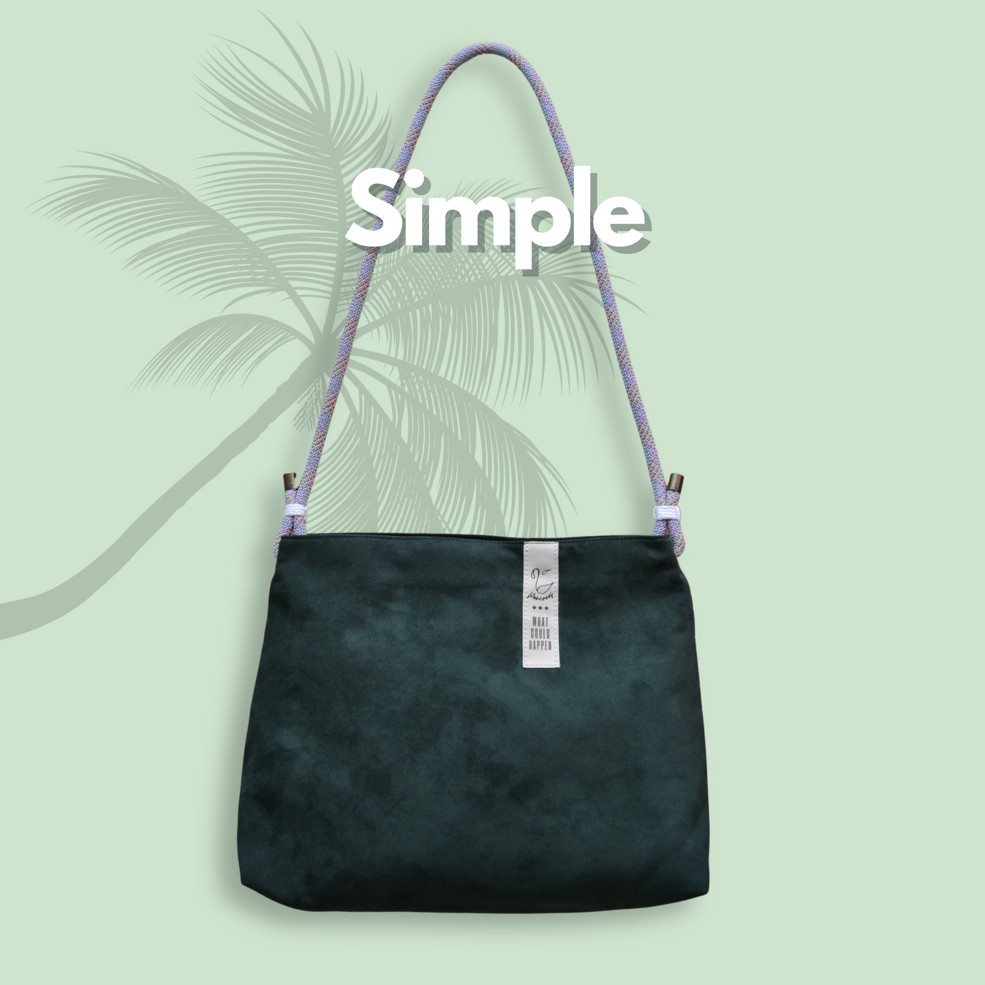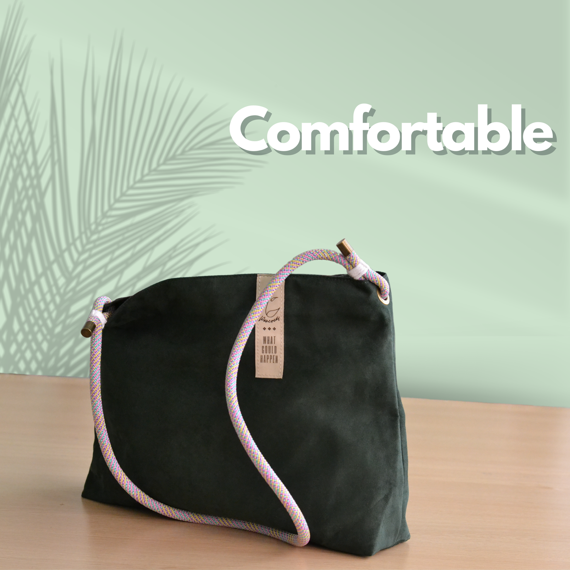 "Evergarden Bag", un sac qui réinvente la suédine. Bandoulière en corde tressée. En ville ou en soirée, ce sac ajoutera une touche d'inattendue et de couleur vert profond à votre quotidien.